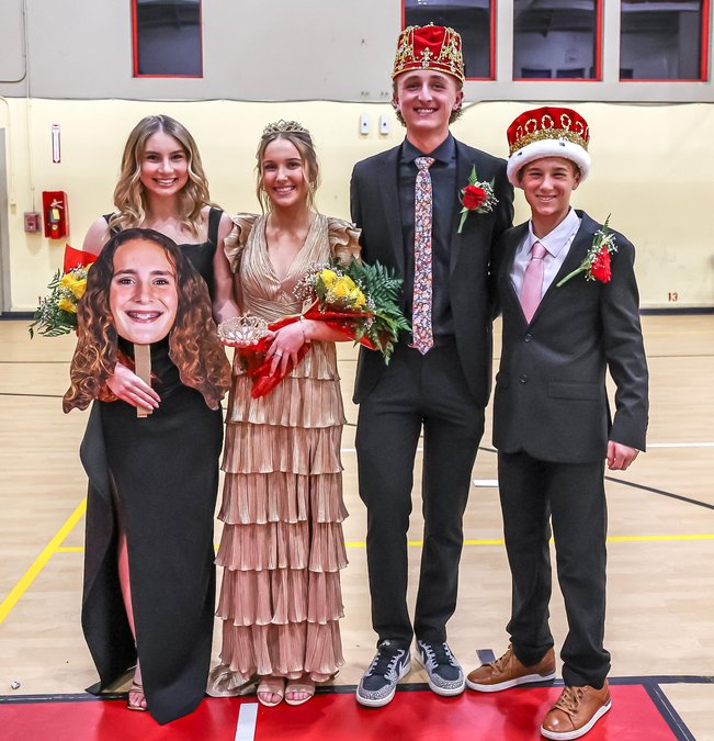 The Winter Homecoming 2026 for Oakdale High School was hosted on Friday, Jan. 23 and included a big varsity boys basketball victory over Patterson. It also saw the crowning of new royalty. Selected were, from left, Homecoming Queen Dakota Burford – not present but represented by Reese Donaldson holding the ‘fathead’ of the queen; Princess Mariah McTague, King Carter Riley and Prince Carter Birchall. The Senior Class won the hall decorating contest.