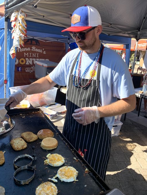 At the ‘Burly Dogs’ booth on Saturday morning, Dane Hauskens was kept busy cooking breakfast sandwiches, grilling up the eggs and hash browns at the Oakdale Morning Market. He and his dad, Josh, were working the booth together in the food court area, while shoppers also found plenty of fresh produce, handcrafted items, baked goods and more along the North Third Avenue corridor. The Saturday market runs 8 a.m. to 11 a.m., continuing through September.