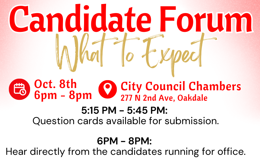 Hosted by the Oakdale Chamber of Commerce, the evening will begin with a time for submitting question cards, offered from 5:15 p.m. to 5:45 p.m.; the forum itself will run from 6 p.m. to 8 p.m.