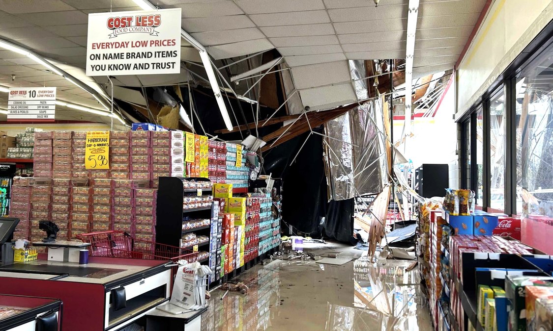 Two people suffered injuries when a portion of the roof collapsed at the Cost Less market in the 800 block of North Yosemite Avenue in Oakdale on Monday afternoon, prompting a full evacuation of the facility. Modesto Fire, Oakdale Police and Oak Valley Ambulance all responded to the scene at about 2:30 p.m. on March 17. Heavy rain and wind in the area Monday – following a few days of rain during the past week – may have contributed to the collapse. Fire department officials on scene said that an estimated 25-by-25-foot portion of the roof in the right front corner of the store, over the produce section, fell in. As it came down, fire officials said, the collapse also broke the store’s fire sprinkler system. There was water inside the store and responding authorities helped evacuate shoppers and store personnel.