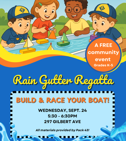 The event will give prospective Cub Scouts and their families a chance to build a mini boat on site with materials provided by Cub Scout Pack 43, then enjoy racing those boats down water tracks for the ‘regatta’ competition.