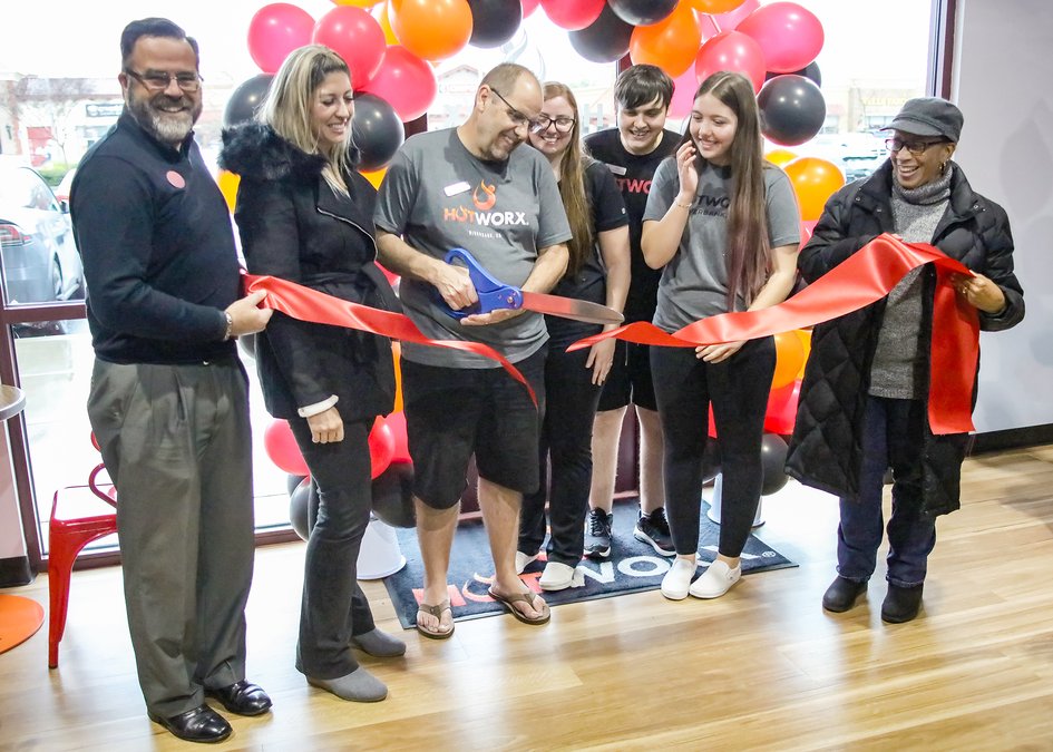 Hotworx owner Mike Wilkins, along with employees, and family members, daughter Becky Dixon, son Wyatt Wilkins and daughter Summer Wilkins, held a ceremonial ribbon cutting, assisted by the Chamber members.