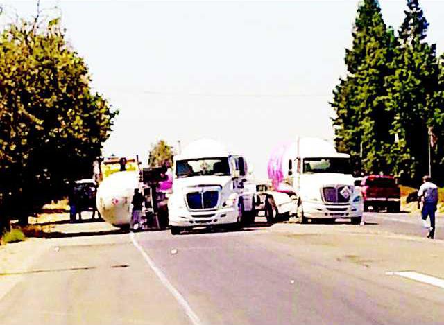 Afternoon motorists were delayed on the way to their destinations on Sunday afternoon, Aug. 11, when a J.S. West & Company propane tank became dislodged, causing the tanker to roll on its side on Highway 120 north of River Road.