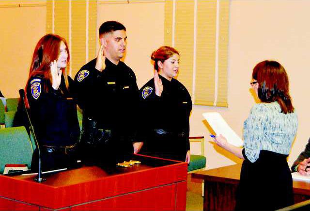 The addition of one new police officer and two dispatchers joined the ranks of the Oakdale Police Department in November, as the depleted agency strives to add personnel lost to injuries, departures and other vacancies. On Monday, Dec 1, Police Chief Lester Jenkins introduced the new crew to the Oakdale City Council, swearing in the new employees and presenting their badges. The new appointees include Officer Samuel Gallego and Dispatchers Janeen Yates and Valerie Borras.