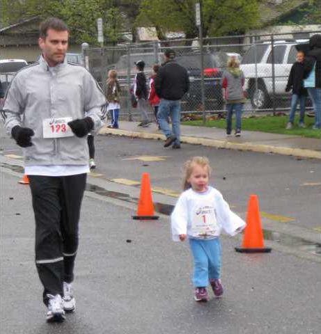 People of various ages participated by racing, jogging, walking, taking toddler steps, and pushing strollers.