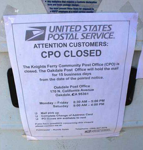 The notice does list the hours for the Oakdale Post Office, at 170 N. California in Oakdale, as 8:30 a.m. to 5 p.m. Monday through Friday and 9 a.m. to 4 p.m. Saturday, with Knights Ferry residents able to get their mail there during those hours.