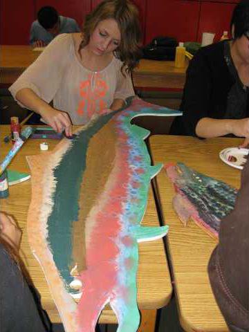 In preparing for the festival over the past couple of weeks, Nancy Kern’s advanced art students at Oakdale High School worked on decorating six life-size and three jumbo wooden salmon cut-outs for the Salmon Festival.
