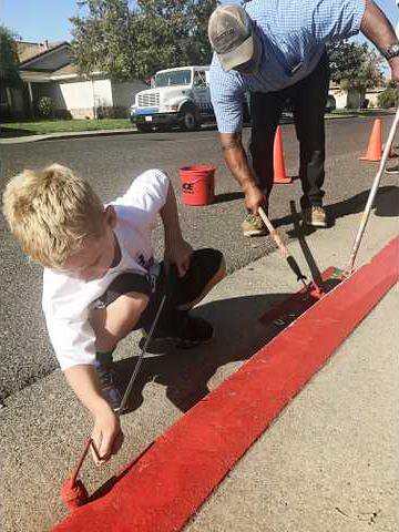 Keaton Thalman, 6, of Oakdale was out early Saturday morning, Aug. 26 with members of Boy Scout Troop No. 47, painting curbs as part of Stephen Badger’s Eagle Scout Project. Badger’s project was sponsored by the Oakdale LDS Church and represents one of six Eagle Scout projects Troop No. 47 has slated within the next eight weeks.