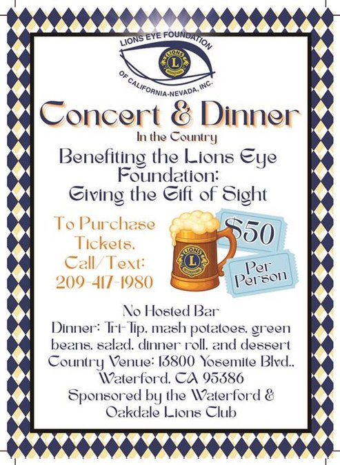 Oakdale Lions Club has partnered with Waterford Lions Club for this first-time event. The dinner and concert will be held Saturday, Oct. 4, 2025 from 5 p.m. to 9 p.m. Tickets are $50 per person which includes a tri-tip dinner featuring tri-tip, mashed potatoes, green beans, salad, dinner roll and dessert.