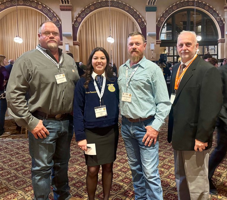 Oakdale High School alum Amanda Osmundson was joined by her uncle, Gary, left, father, Gregory and OHS Ag teacher Ed Hartzell while attending the National FFA Convention in Indianapolis. Photo Contributed