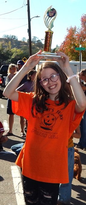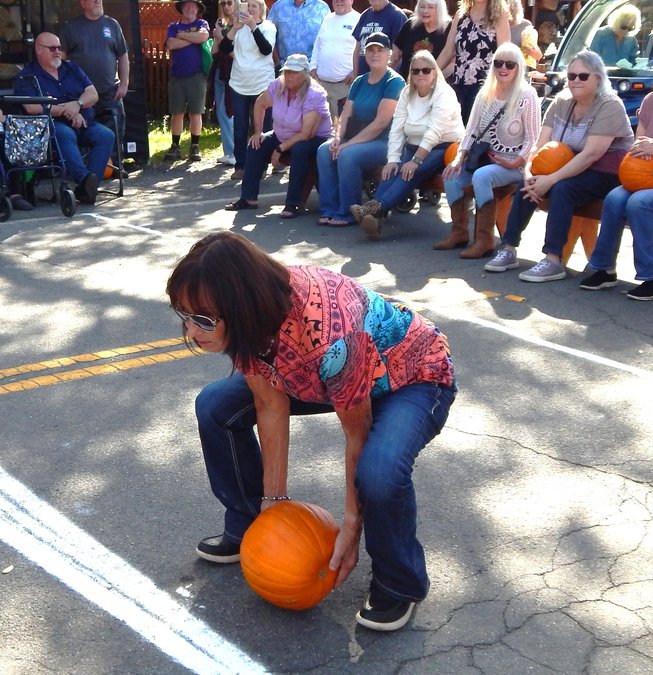 Some contestants gently rolled their orange orbs down the street while others had pumpkins that just kept rolling, rolling, rolling down the street – off the chalked course – and towards the Stanislaus River. Jett Chandley, champion roller for the boys 6-to-12 age group, greeted his friends by sharing how far his pumpkin had rolled as it got closest to the finish line.