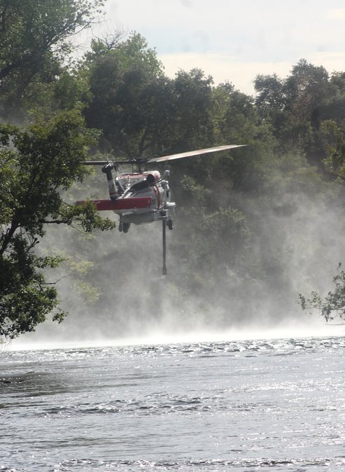 Multiple fire units, in addition to two helicopters, were on scene of a brush and grass fire in the 13000 block of Orange Blossom Road on Tuesday afternoon, July 22. The fire was first reported near the 13600 block shortly before 3:30 p.m. and crews arriving on scene indicated the fire was initially at one to two acres with a moderate rate of spread. Additional units were called in quickly, as the fire expanded to an estimated four acres within about 20 minutes of the original call. Two helicopters were flying along the Stanislaus River, approaching off nearby Lancaster Road, hovering as they picked up water and then returning to drop it on the fire. Several passes were also made by planes dropping retardant during the early firefighting effort, with the retardant visible on several properties and along portions of some roadways in the area.