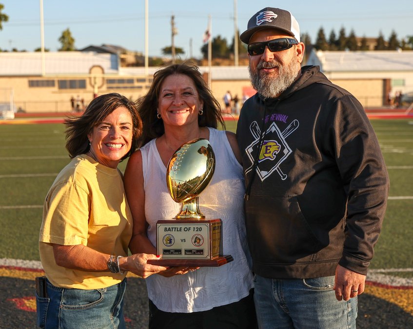 The Battle of 120 Mayor’s Trophy is staying put. And for many players on the Oakdale Mustangs varsity football team – not to mention their fans – that’s a source of pride. Oakdale hosted Escalon in a non-league contest on Friday night, Sept. 5 in The Corral. The teams have played the past few years, vying for a special trophy, dubbed The Mayor’s Cup. Friday night, the Mustangs took a 27-13 win off the field, and Oakdale Mayor Cher Bairos was more than happy to hoist the trophy, after sharing a smile and handshake with Escalon Mayor Andy Hagan.