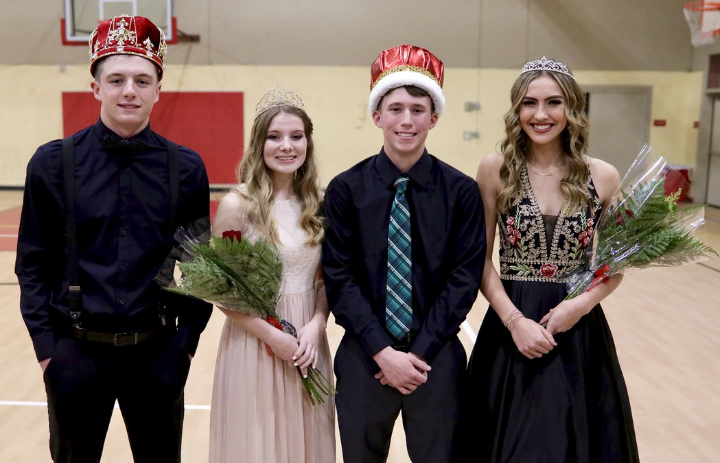 The Winter Homecoming Court was crowned as part of the Friday night, Jan. 24 wrap up of the week’s Homecoming festivities at Oakdale High School. Taking time to smile for the camera after receiving the crowns were, from left, King Gage McPhee, Queen Afton Daley, Prince Grant Edwards and Princess Kylie Nunes. On the court, the basketball Mustangs hosted East Union in the Homecoming contest, with senior Michael Echavarria scoring 15 points in the varsity loss. Second photo shows newly announced Queen Afton Daley, all smiles as she receives her crown and gets ready to accept congratulatory hugs from the rest of the court on Friday night. The evening also featured announcement of the Hall Decoration Award winners, with that honor going to the sophomore class.