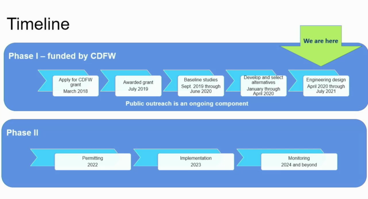 Phase II will excavate perched floodplain, will create three to four spawning riffles/rearing habitat, and reduce habitat for predatory fish. The majority of the funding will go to implementation of on the ground restoration of the habitat. Part of the funding will go towards required environmental permitting and compliance and no General Fund money will be needed to complete Phase II of the River Restoration Project.