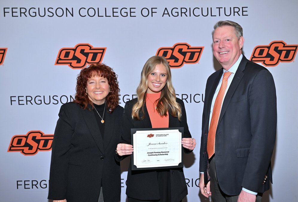 Oakdale High School graduate Jenna Sanders was honored by the Oklahoma State University Ferguson College of Agriculture with academic scholarship support for the 2026-2027 academic year. Sanders was joined by Dr. Cynda Clary, associate dean of academic programs and Dr. Jayson Lusk, vice president and dean of OSU Agriculture, at the presentation.