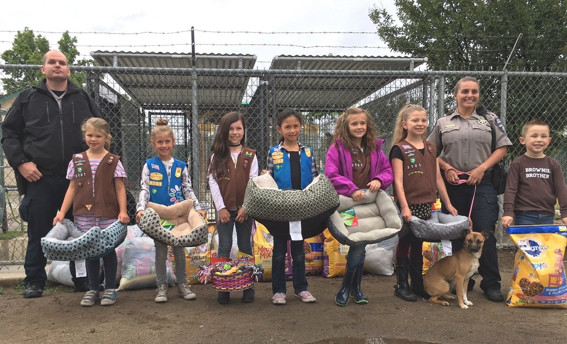 Members of the Oakdale Daisies and Brownies Troop 3101 recently paid a visit to the Oakdale Animal Shelter, which serves both Oakdale and Riverbank. With some of the funds raised from their cookie sales, the troop was able to bring a few donations to the shelter. They donated beds, food, and toys as well as blankets and towels that they collected to comfort the animals. Shelter staff members Jeff Whorley and Danielle Merritt, along with Trixie who was adopted to a new home, took a moment for a photo opportunity with troop members during their visit.