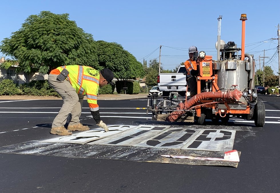 A crew from Chrisp Company – with offices at several locations around the state including the Central Valley – were putting down the stencils and painting the ‘STOP’ signs at several intersections around Oakdale recently. Here, they were busy on Saturday morning, Sept. 21 at North Sixth Avenue and East E Street, also painting bright new white lines signifying crosswalks in the area as a way to help enhance pedestrian safety.