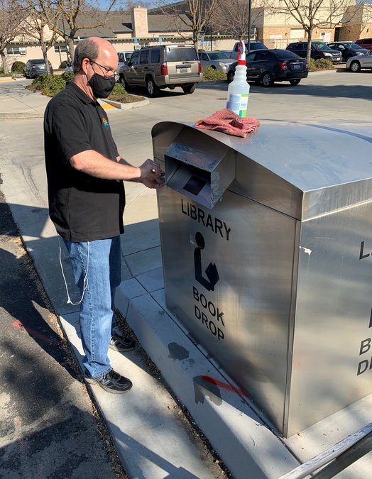 It is a small sign of progress; Stanislaus County Library staffer Brent Lowe cleans up and prepares the ‘book return’ outside the Oakdale Library branch on South First Avenue recently, as it has now re-opened for use by patrons. The curbside book drop had been closed for several months due to COVID-19 but is now back in service for the return of checked out materials. Stanislaus County is seeing improvements in COVID numbers but remains in the state’s ‘Purple Tier’ status.