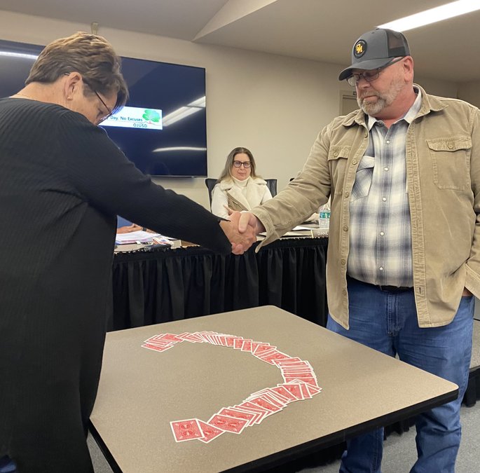 In the end, the tie would not be settled by the high card but rather the high suit, as both candidates pulled a ‘9’ from the fanned deck of cards. Taylor drew a 9 of hearts and Kjeldgaard a 9 of diamonds – once again, in effect, tying.