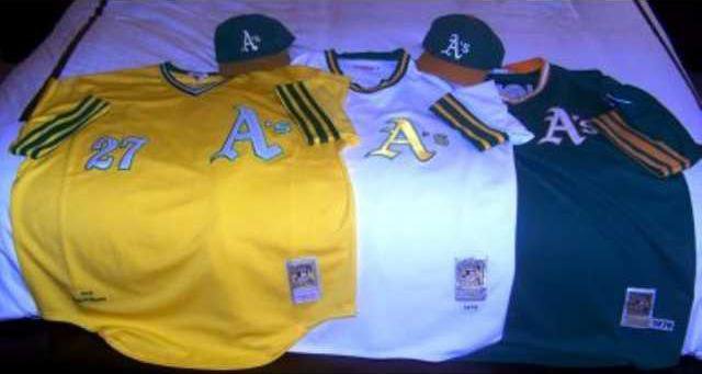 There’s the vest style “OAKLAND” from 1968, the single ‘A’ vest in white and gold for 1969 not to be confused with the “A’s” style for 1970 and 1971 (both white and gold) and all three of the Kelly green, Fort Knox gold and wedding gown white double knits that they switched to in 1972 (that style lasted until 1981). I also have the caps to accompany them too.