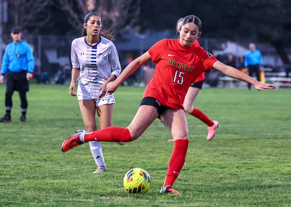 Tightening their grip on first place in the Valley Oak League, Oakdale’s varsity soccer girls defeated Central Catholic 4-1 in a road game on Jan. 28, then shut down Patterson in a home game on Feb. 2, winning 3-0. They improved to 9-0 in the VOL with the wins.