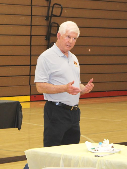 Following the ceremony, varsity assistant coach Jack “Papa Coach” Strang announced his retirement. Strang entertained the crowd on hand with special memories of coaching at Oakdale High School and led a final “Let’s Go Oakdale” chant.