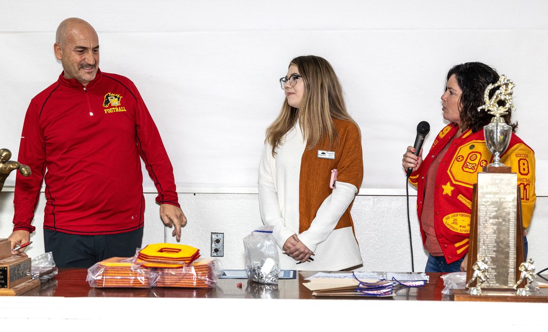 In the final Football Awards Night of his career, earlier this month in Oakdale, the longtime leader of the Mustangs, head coach Trent Merzon, left, was recognized for his many successes during his tenure with the program. Among those presenting honors was the City of Oakdale, with Mayor Cherilyn Bairos, right, offering a few words while council member Kayleigh Gilbert looks on and shares a smile with Merzon. He officially retired from coaching after completing the 2022 football campaign with the OHS varsity Mustangs.