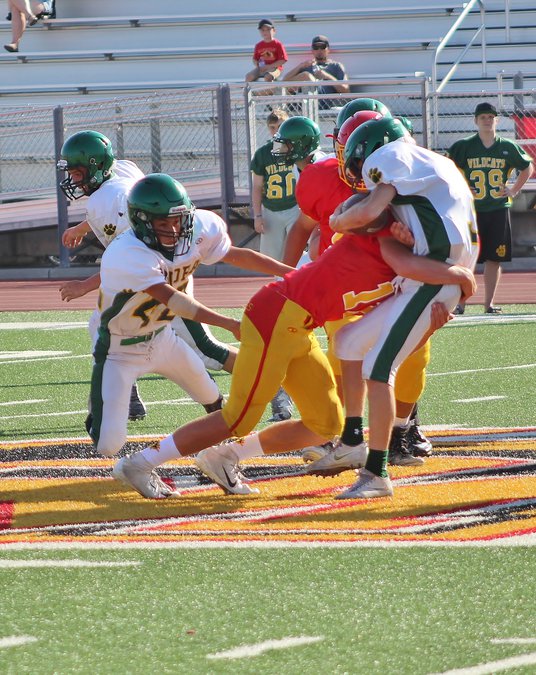 The following night the junior varsity team took the field in front of a large crowd inside The Corral. Sonora struck first when Rylan Matysock scored from four yards out in the first quarter; it was the only score of the first quarter and the only trip to the end zone for the Wildcats. Oakdale’s defense was led by Gage McPhee, Caden Frazee, Noah Chelberg and Derek Vermeulen. The defense shut out the Wildcats the rest of the way and Vermeulen scored on a pick-six with less than 30 seconds remaining in the game.