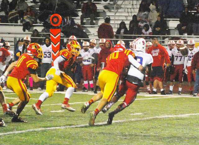 Oakdale scored the game’s lone first quarter points on a Cameron Cherry 17-yard rush with 8:25 left in the quarter. Cherry finished the game with 182 rushing yards on 16 carries. East Union had early opportunities to keep it close but a missed 24-yard first quarter field goal attempt was botched on a bad snap, and recovered by Joshua Jacobson of Oakdale. Toward the end of the first half, the Mustangs defense held off the Lancers again when two-way player Bronson Harmon intercepted the ball at their own 37 yard line. Oakdale broke the game open in the second quarter, outscoring the Lancers 21-0. Two rushing scores by Harmon and a rushing score by Bearden gave the Mustangs a commanding 28-0 halftime lead.