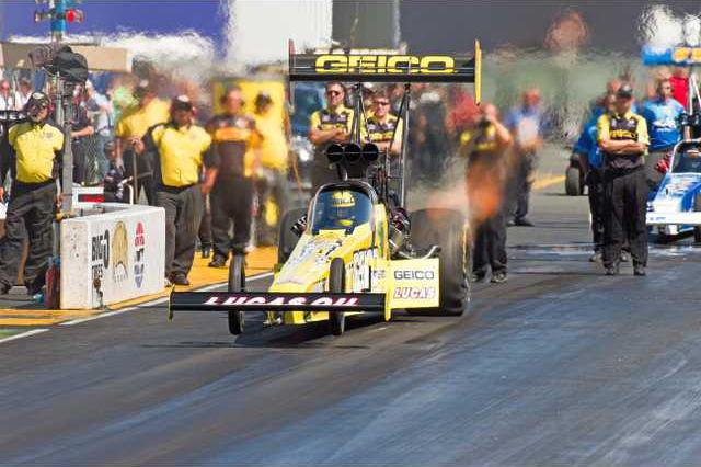 Qualifying runs at the 26th Annual NHRA Sonoma Nations at the Sonoma Raceway produced many exciting performances, but the July 28 eliminations added more. The outstanding track conditions seen during the Friday night qualifying sessions reappeared during the first round of eliminations, for those teams that could get the right tuning set up. With it came a few upsets, where lower qualified cars defeated higher qualified cars and track records lowered. In Top Fuel, Morgan Lucas in his Geico/Lucas Oil dragster defeated TJ Zizzo in his Peak Oil dragster with a 3.757 at 328.30 mph to 3.835 at 321.81 mph. This was Lucas’s best time of the event as he would march his way into the final round. For Zizzo, the 3.835 served to back up his career best 3.821 in qualifying and the 321.81 improved on his career best speed. The stout track conditions also contributed to the first major upset of the day, as Tommy Johnson Jr defeated the #2 qualfiier, Steve Torrance, from the 15th position. Johnson was able to step up and run strong 3.786 at324.51 mph effort to continue into the 2nd round, where., his day would end at the hands of 2012 Top Champion, Antron Brown. The final round featured #8 qualifier, Morgan Lucas, who took out David Grubnic (#1 qualifier), Spencer Massey (#5 qualifier) and reset the track speed record to 328.30 mph along the way, against Shawn Langdon. Langdon came in as the series point leader with his Al-Anabi dragster and had reset the track elapse time to 3.743 seconds. As the cars launched down track in the final, Langdon had the gained the starting line reaction advantage and drove away to a 3.90 at 240.47 mph win, as both cars suffered from loss of traction problems during the run. With the win, Langdon extended his lead in the series championship in the top fuel category