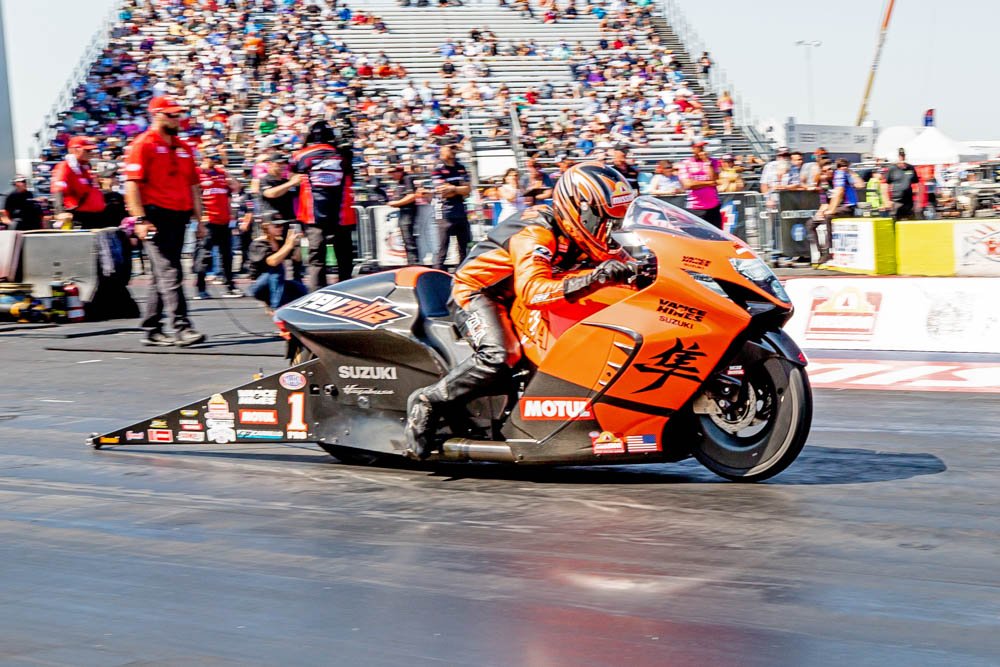 In Pro Stock Motorcycle, Gaige Herrera is very close to locking up the season championship. He qualified No. 1, again, with a 6.749 at 202.52 mph with Matt Smith second (6.756 at 202.77 mph). But Herrera did not just breeze through eliminations. In fact, he gave many unplanned opportunities for Smith to win the event, suffering from uncharacteristic bad reaction times to performance drop offs. But, in the end, the real Herrera stepped up and took the win over Smith with a 6.816 at 200.56 mph effort, as Smith’s bike suffered mechanical issues on the run.