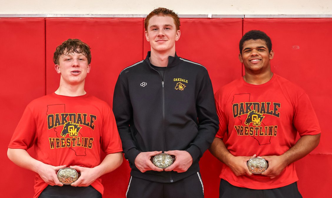 At the James Riddle Memorial Tournament hosted at Oakdale on Saturday, Dec. 13, a trio of Mustangs came away with championships. Griffin Gerber, at 170 pounds; Xander Birakos at 190; and Matthew Cooley at 285 pounds were all winners of the tournament belts for first place performances.