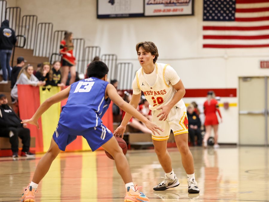 Following intermission, the teams played tentatively in the third period with Sierra outscoring the Mustangs 10-8, but then both clubs opened up in the fourth period with the Mustangs outscoring the visitors 23-18. Leading the way was senior forward Criswell who played hard the entire night, garnering a team high 23 points, including four treys. Jayden Coelho scored all of his seven points and Jackson Holt all of his six points in the second half, most coming in the fourth period. Coelho and Niko Klose each had a three-pointer to complement Criswell’s two in the second half. In the waning moments, the Mustangs made a run aided by a small but boisterous student rooting section plus the Mustang drum line. The Mustangs, still trailing, were forced to foul in the final 90 seconds of the game with the Timberwolves’ Cunial hitting six in a row complemented by Chohan’s two. Still, the Mustangs held tough. A last minute inbounds play by the Mustangs, following an outstanding defensive play by Coelho, fell short of the hoop, however, and Sierra walked away with the narrow win.